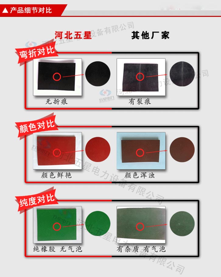 絕緣膠墊產品顏色為黑色、紅色、綠色。 不含雜質:原生橡膠材質,不含次生膠,切面不會有粉末 柔韌性好:具有優良的絕緣性能,彈性強,拉伸強度大 光澤度高:原生橡膠材質,無任何塑料成分,表面光澤度高 無氣泡:五星電力絕緣膠墊,表面無氣泡,無裂痕